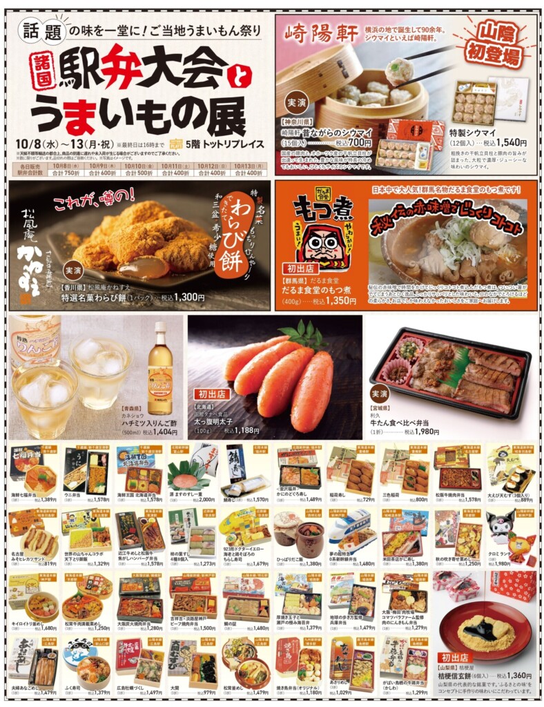 山陰初登場!シウマイでおなじみの「崎陽軒」をはじめ、群馬名物「だるま食堂」のもつ煮、わらびもちなど人気の味が会場に大集合!毎回好評の駅弁も90種類以上をラインナップ。ぜひこの機会にご来場くださいませ。(※最終日は16時まで)