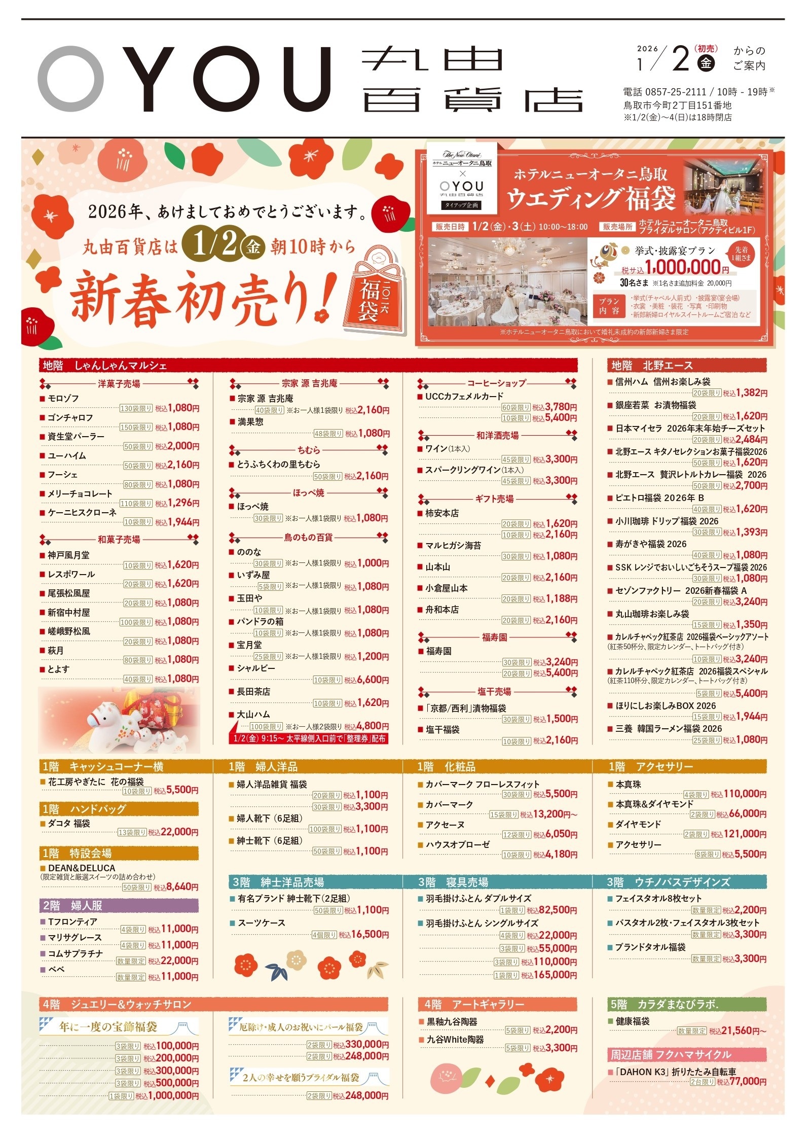 2026年 福袋 1月2日(金)~ 各階 各フロアに魅力あふれるお楽しみがギュッと詰まって盛り沢山!グルメやファッション、コスメ、ジュエリーなど人気の福袋を豊富に取り揃えております。数に限りがございます。お早めにどうぞ。※画像をタップで拡大します。