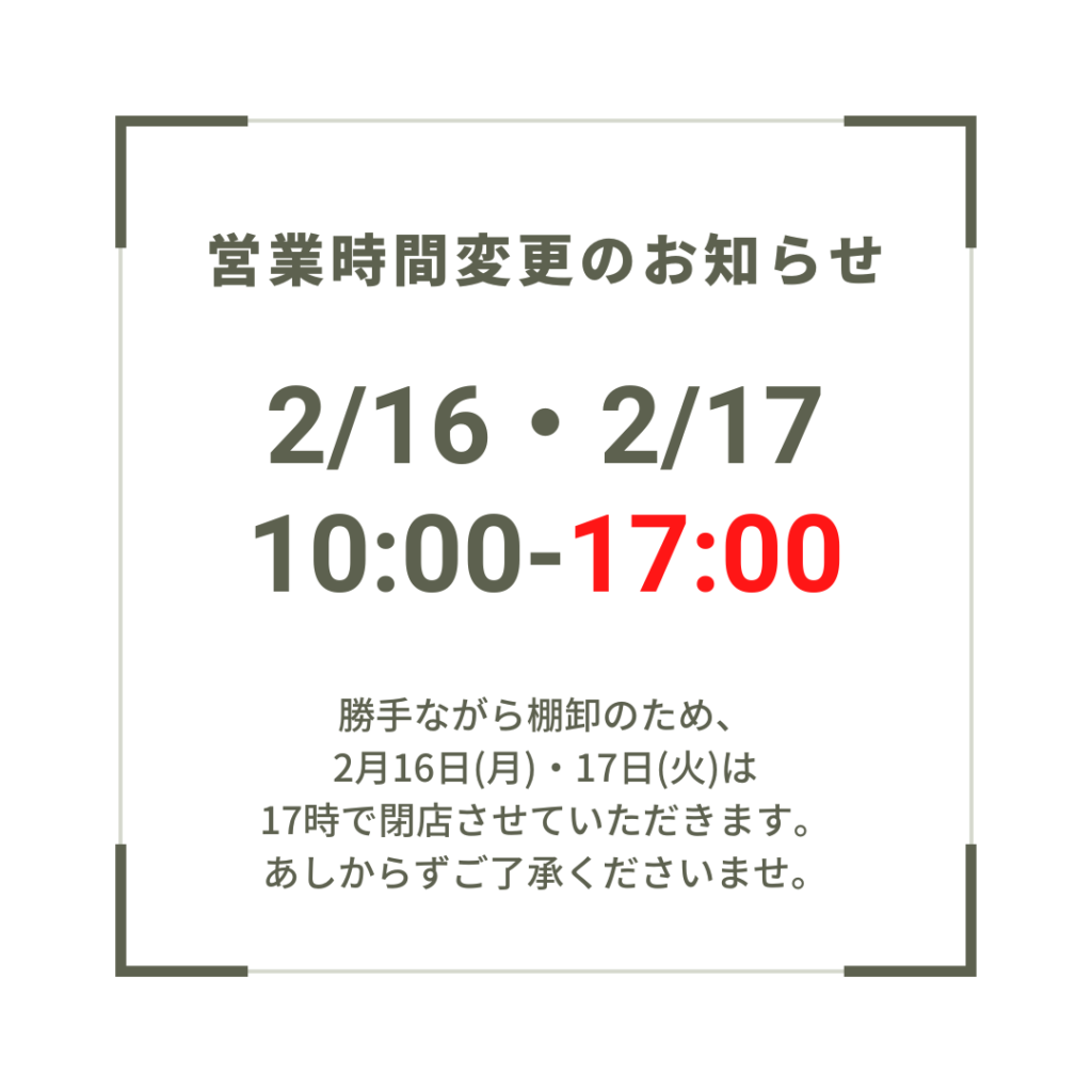 勝手ながら棚卸のため、2月16日(月)・17日(火)は17時で閉店させていただきます。あしからずご了承くださいませ。